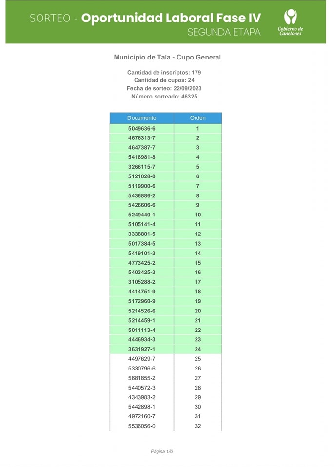 El viernes se llevó a cabo el sorteo del programa Oportunidad Laboral Fase IV, en el cual se asignaron un total de 27 puestos de trabajo para nuestro Municipio. De estos, 24 correspondieron al cupo general, 2 se reservaron en virtud de la ley N⁰ 19122 para personas afrodescendientes, y 1 se destinó de acuerdo con la ley N⁰ 18651 para personas con discapacidad.